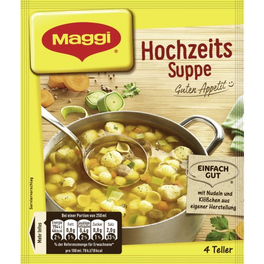 Eine Hochzeitssuppe ist eine klassische Suppe, die bei Hochzeiten serviert wird. Doch warum auf die nächste Hochzeit warten? Mit Maggi Guten Appetit Hochzeits Suppe kann die herzhafte, klare Suppe jederzeit spielend leicht auch zuhause zubereitet werden. Mit leckeren Grieß- und Fleischklößchen, feinem Gemüse und Muschelnudeln ist die klare Suppe von Maggi einfach die perfekte Hochzeitssuppe!