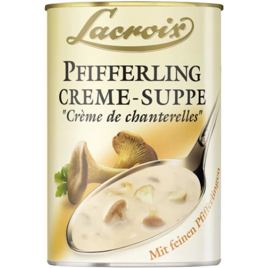 Zutatenverzeichnis: Wasser, Pfifferlinge 4 %, SAHNE 3,5 %, pflanzliche Öle (Palmöl, Rapsöl), modifizierte Stärke, Steinpilze, Zwiebeln, Jodsalz, WEIZENMEHL, AROMA (enthält SOJA, MILCH und SELLERIE), MILCHZUCKER, Tomatenmark, Gewürze, Säureregulator: Natriumcitrate; MILCHEIWEIß, MOLKENEIWEIß, Zucker, Verdickungsmittel: Guarkernmehl und Xanthan; GERSTENMALZEXTRAKT, Emulgator E 472e, färbender Kurkumaextrakt.